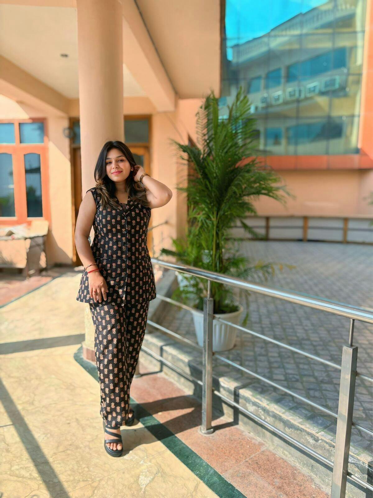 Embrace timeless elegance with our handblock printed, three piece co-ord set, featuring a graceful bralette with smocked back and elasticated straps with a sleeves blazer style top and straight fit pants with elasticated back belt and pockets. The blue floral screen print on white 100% cotton fabric completes the look. Style these piece together or separately this summer for comfortable and chic look.