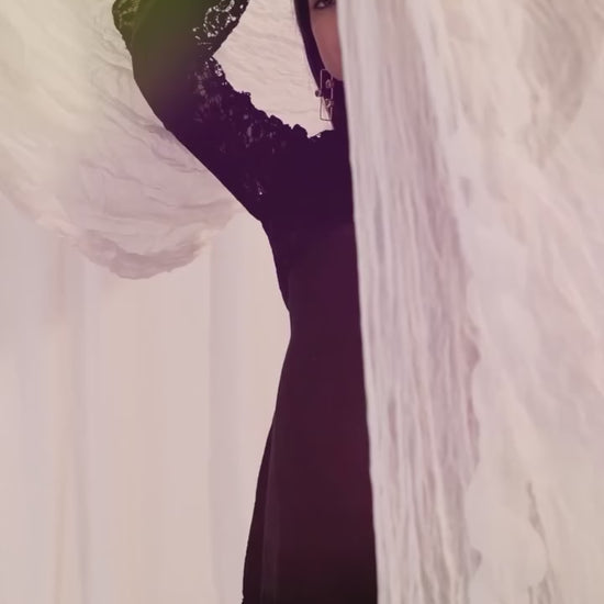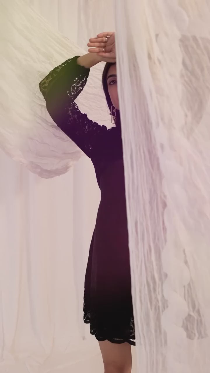 The Black Nyx Dress is an ethereal short dress with A-line silhouette, V-neckline, laced Yoke and sheer laced full balloon sleeves. The fitted bust and A-line Silhouette with laced hem gives it the more detailed looks.