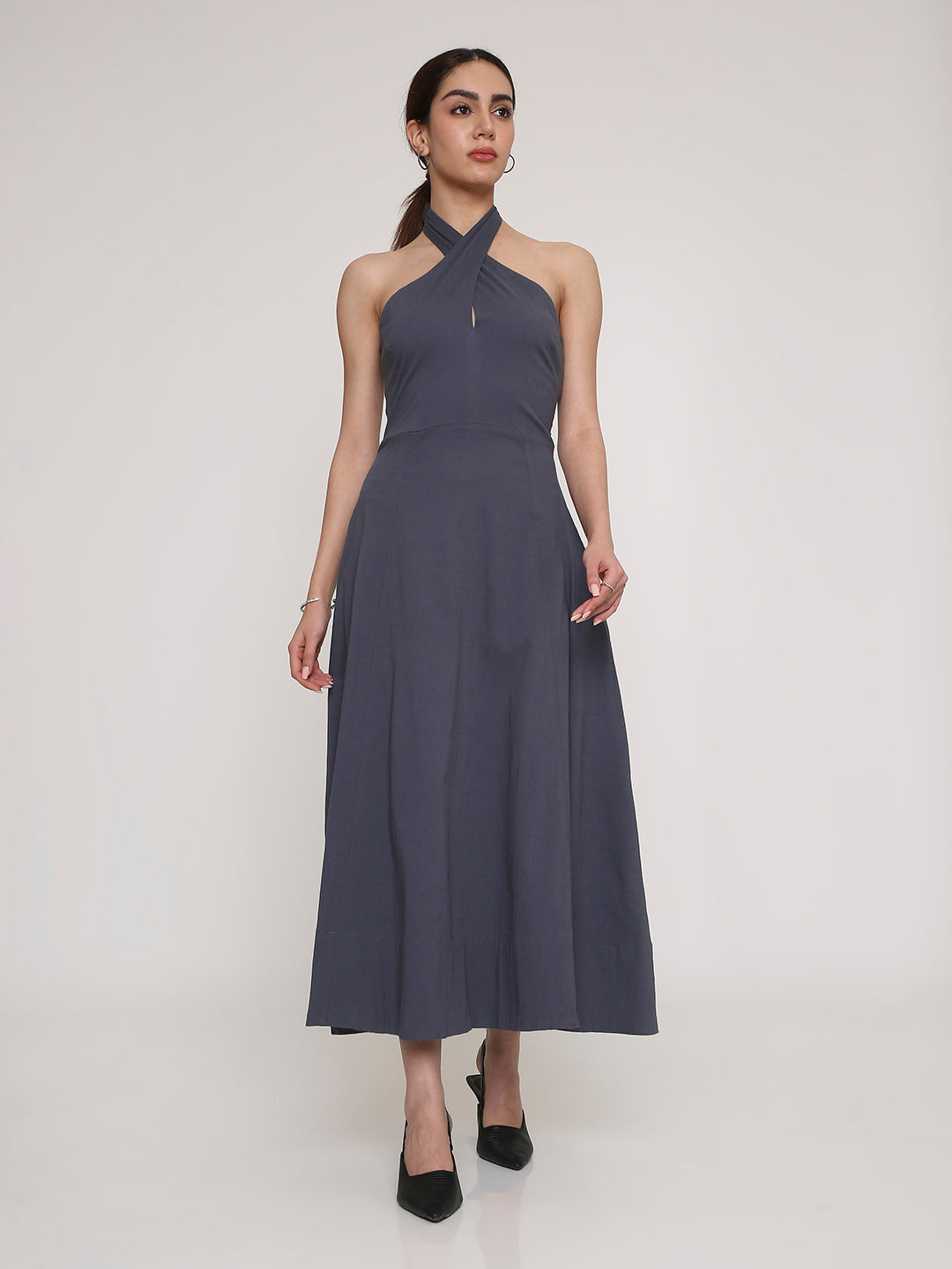 Soft, fluid, and quietly striking—this grey halter neck midi dress is designed to move with effortless grace. The cross halter neckline frames the shoulders beautifully, while the fitted waist flows into a relaxed, airy skirt that skims the body without clinging.