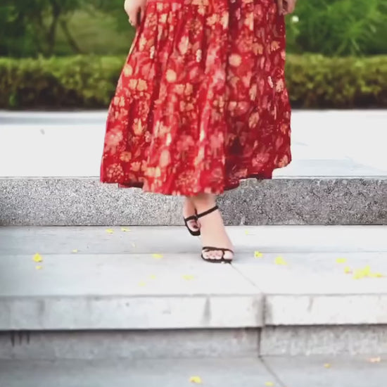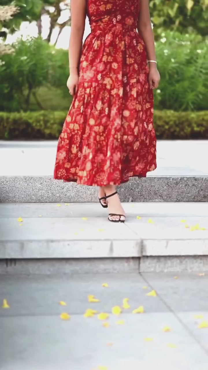 In a vibrant hue of Red, our red halter dress showcases the lively spirit of spring with its charming rose chintz print. Crafted from airy 100% cotton, it boasts a flattering halter neckline, a waist adorned with smocking at the back, and delicate gathered flayers in three layer. Elevate your summer style by pairing this dress with a hat and a bucket bag for a cheerful, upbeat look.