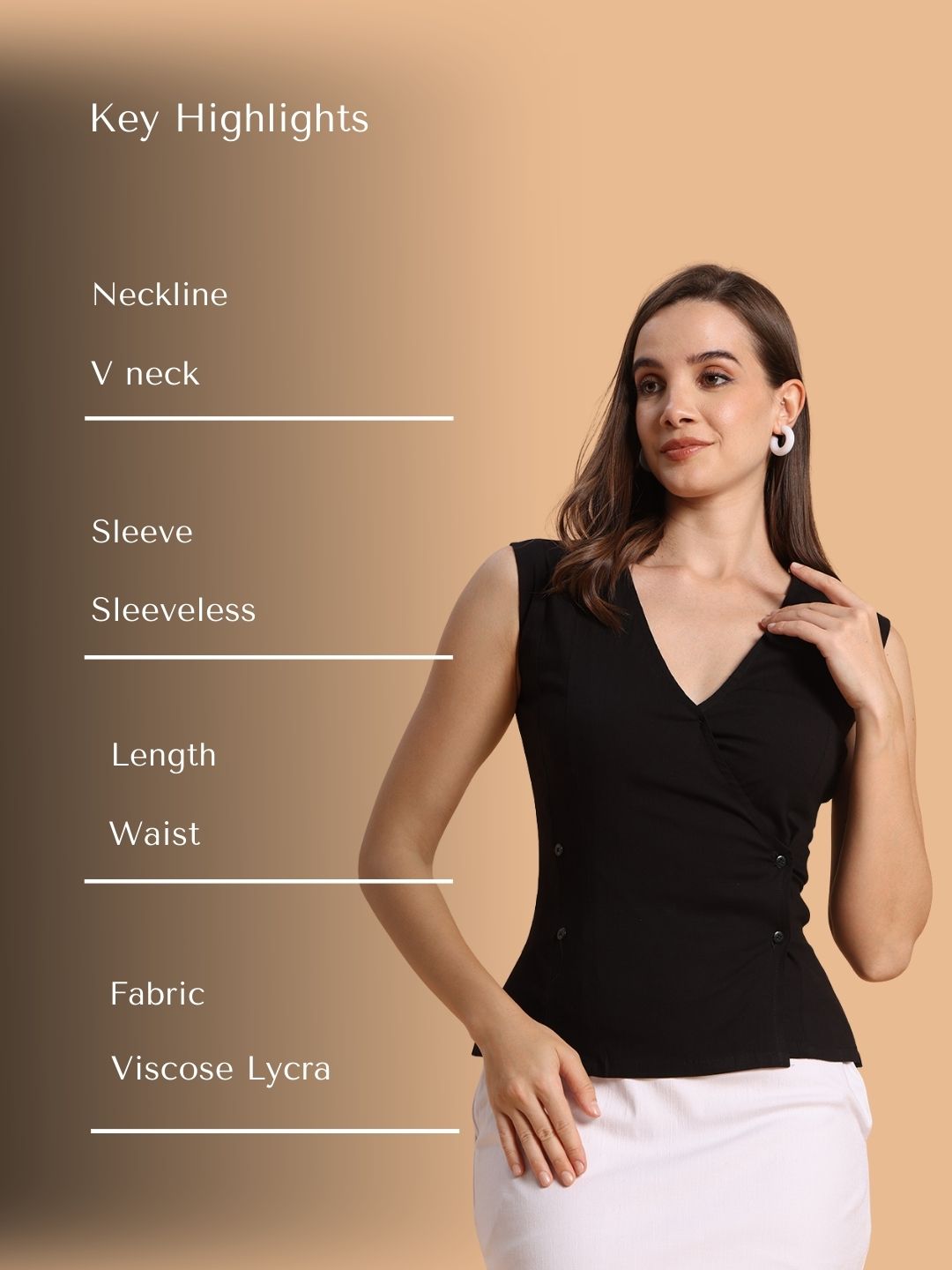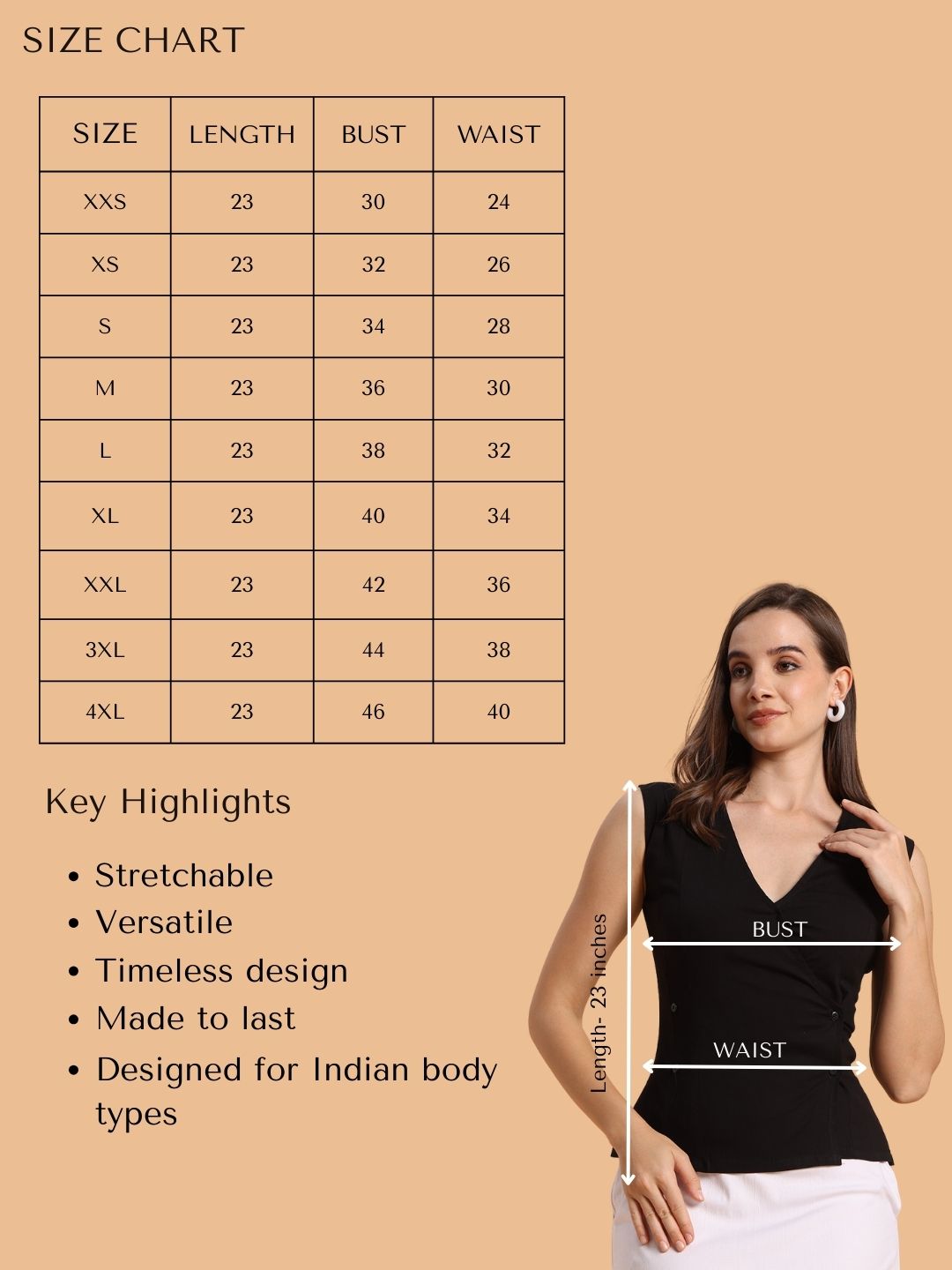 Elevate your layering game with this wrap-style waistcoat, crafted in sustainable and stretchable fabric for a structured yet comfortable fit. Featuring a sleeveless design with a deep V-neckline and overlapping front with button details, this piece adds a polished, contemporary edge to any outfit. The versatile cropped length makes it perfect for pairing with high-waist trousers, skirts, or even layering over dresses. Designed to balance minimalism with modern tailoring, this waistcoat is ideal for both office chic and evening sophistication.
